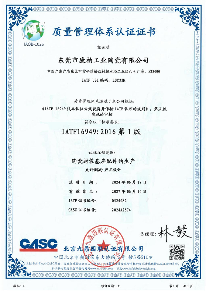 經(jīng)過一系列嚴(yán)苛的審核與評估程序,東莞市康柏工業(yè)陶瓷有限公司成功獲得國際汽車工作組(IATF)頒發(fā)的IATF 16949汽車認(rèn)證體系證書,標(biāo)志康柏工業(yè)陶瓷在汽車行業(yè)質(zhì)量管理體系方面達(dá)到了國際先進(jìn)水平。